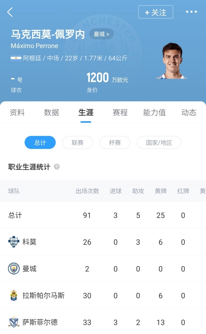 2023年1月,曼城花费1100万欧从萨斯菲尔德签下佩罗内,上赛季球员被外租至科莫效力,出战26场比赛,贡献3次助攻,目前球员德转身价1200万欧。